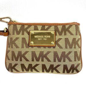 Handsome little wristlet wallet by Michael Michael Kors in khaki signature canvas with brown leather trim and gleaming gold tone hardware. 6" strap acts as the top zipper pull and can be worn as a wristlet or can attach with the dog clip to the top of the wristlet to carry as a mini bag. Large enough to fit credit card, ID, essential make up items and/or small phone. Like new condition.