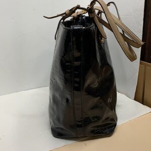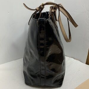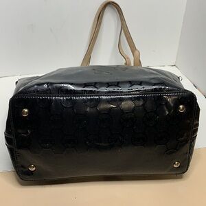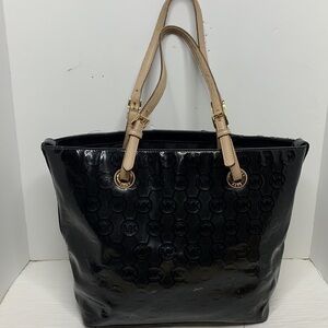 Michael Kors Jet Set tote. In black monogram with buff leather handles and gold hardware. Outside has 1 slip pocket on back. Inside lined in MK fabric and has 4 slip pockets and 2 zipper pockets bag has been loved and handles How some minor rubbing ( just a bit dirty looking) Bag Is in great condition with no holes, rips no exposed piping
