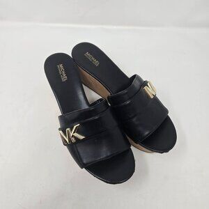 Michael Michael Kors Jilly black cork Platform slide wedge sandals womens size 9 Good preowned condition minor scuffs on toes see pics for details and wear color may appear differently depending on light. these are preowned so may need some cleaning. may have some glue residue or marks on the bottoms.