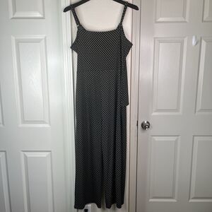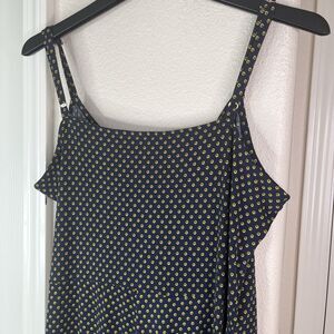 The Michael Kors Jumpsuit size Large, new without tags in navy blue with a gold geometric print is a stylish one-piece outfit perfect for a party or casual occasion. This wide-leg jumpsuit features a sleeveless design, V-neckline, and a unique side-tie closure. Made from a blend of polyester and spandex, the jersey fabric offers a relaxed fit for comfort. Adjustable straps.