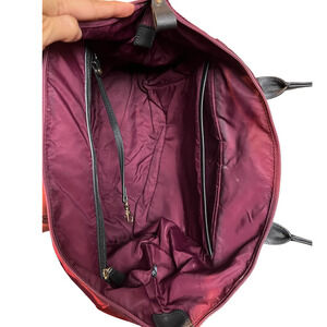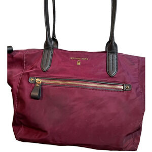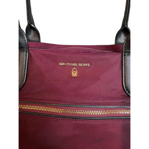Michael Kors Kelsey Medium Top-Zip Nylon Tote / Size Medium / Color maroon red / Pre- Owned / 1 interior zip pocket & 3 slip pockets / laptop compartment-std 13”-15” / nylon, lining Polyester, trim faux leather gold hardware / beautiful bag, but does have stains. Hopefully the pictures will show them.