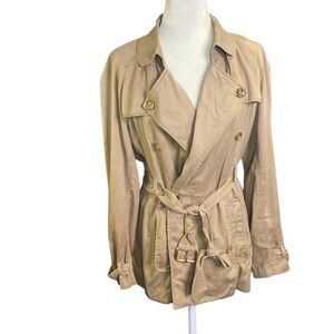 Michael Michael Kors tan trench coat, size large. Classic double-breasted style with gold-tone buttons, belted waist, and adjustable cuffs. Lightweight 100% lyocell twill with a soft, drapey feel. Measures 22” across the shoulders and 28” long. Fits up to an XL comfortably.