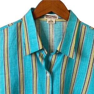 Michael Michael Kors Linen Button Up Shirt Striped Long Sleeves Teal
