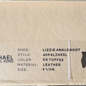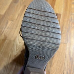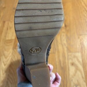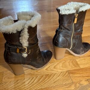 Distressed toffee (brown) ankle boot with Sherpa Trim; Rubber heal 2 1/2 inches high. Gold Michael Koss Medallion. Slight separation on the sole (see photo); Height from bottom of heel to top of boot is approximately 8 1/2". Size is 6 1/2 but runs small.