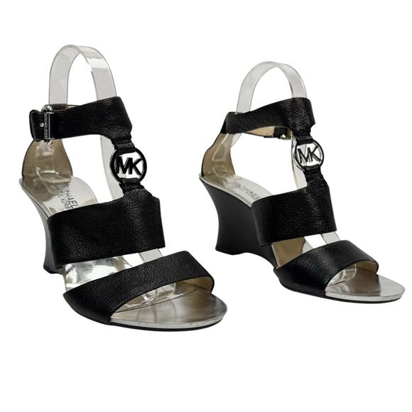 Michael Michael Kors Logo Black Leather Metallic Strappy Wedge Sandals Sz 7.5M