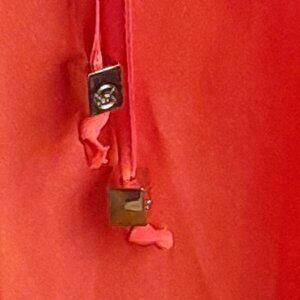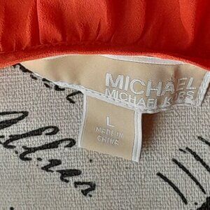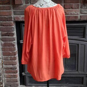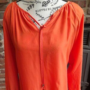 Size L Orange Tie v neck with gold tone initial beads. Gently Loved. This is a very drapey poetic blouse. Has elastic at cuffs on this 3/4 length sleeve