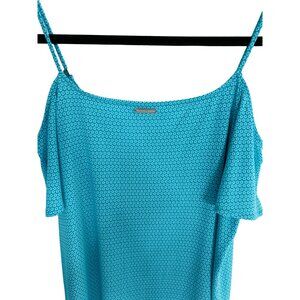 Michael Kors dress, turquoise dress, women's summer dress, cold shoulder dress, patterned dress, loose fit dress, spaghetti strap dress, women's fashion, designer dress, summer fashion, casual dress, beach dress, lightweight dress