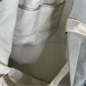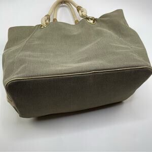 In great condition. Minimal spots from wear inside. Minimal wear to metalware. Anchor hook and rope handles. Coastal, beach bag, vacation, nautical, boating, minimalist, neutral, earth tone. Taupe color and beige interior.