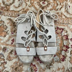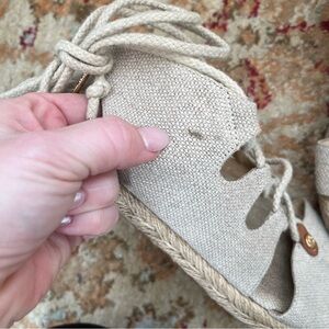 Michael Michael Kors McKenna Lace-Up Espadrille Sandals 7. A jute-wrapped platform and carefree ghillie lace design add a relaxed beachy feel to any look in MICHAEL Michael Kors' McKenna gladiator espadrilles. Round-toe lace-up ankle-tie platform espadrille sandals. Ghillie lace and wrapping ankle tie design. 1/4" jute-wrapped platform. Denim fabric upper; rubber sole. Worn several times with some marks on the outside. Also the inside is cracking a little but doesnt show when wearing.