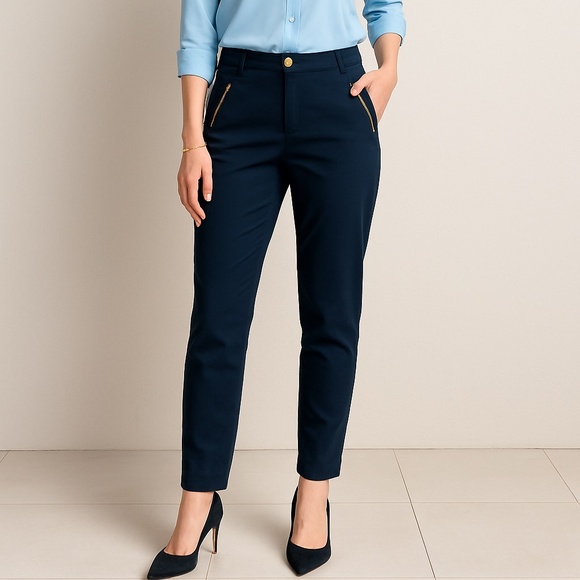 Sleek, modern, and endlessly versatile — these navy ankle pants by Michael Michael Kors feature signature gold-tone zip pockets for a polished finish. The structured cotton-blend fabric offers just the right amount of stretch for a comfortable yet tailored silhouette. Perfect for work, dinner, or elevated casual wear.