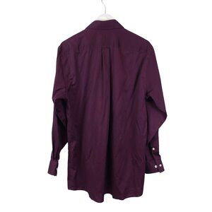 Really nice wine color button down shirt that is lightweight and soft. Great for work or to wear for a date night. This did not have a fabric tag but it is likely cotton or a cotton and polyester blend.