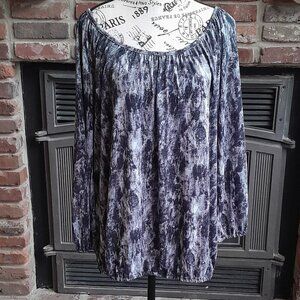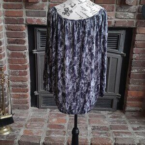 Add a touch of romance to your wardrobe with this stunning Michael Michael Kors off the shoulder top or wear it on your shoulders. Featuring a bold ink blot pattern in black and grey, this top is perfect for dressing up or down. With elastic at the waist and cuffs, it's both flattering and comfortable. Size L Gently Loved Approx. Measurements: Bust 46", Arm length from neck seam to cuff 24" Length from shoulder to bottom 27" 95% Polyester 5% Spandex