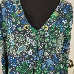 Add a touch of elegance with this paisley V-neck blouse. The blue and green hues create a stunning look for any occasion.