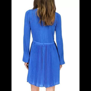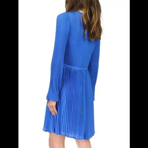 This is a Michael Michael Kors Fit and Flare Dress in size S. It features a V-Neckline, long sleeves, and a pleated design in a solid blue color. Made of polyester, this short dress is suitable for parties, casual or formal occasions. It is machine washable and has a stylish design with a flattering fit and flare silhouette.