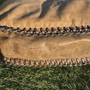 There is spots on the inside of the bag and a cigarette burn. There is some spots on the bottom of the bag and some wear on the handle.