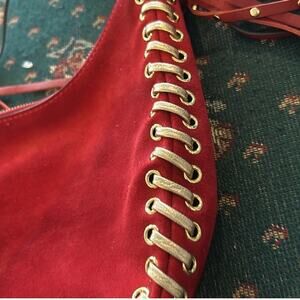 Michael Michael Kors Red and Gold Grommet Whipstitch Suede Fringe Rhea Crossbody
