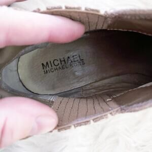 Tan suede with gored panels to pull on. Stacked heel.