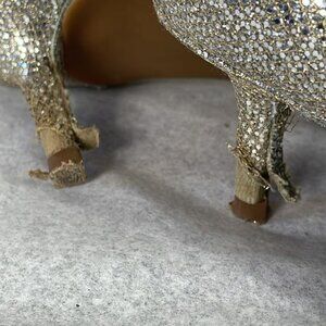 Preowned. Both heels have peeling at the bottoms. Could try to conceal by dotting silver glitter nail polish on. The other parts of the shoes are in very good condition.