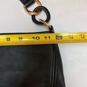 Michael Michael Kors Black Leather Shoulder Bag. Single shoulder strap with chain link detail. Single compartment with 4 slip pockets and 1 zip pocket. Top zip closure. Lined in black logo fabric. Soft pebble leather. Slouchy. Small spot on handle with over stitching. Gold logo hardware.