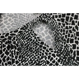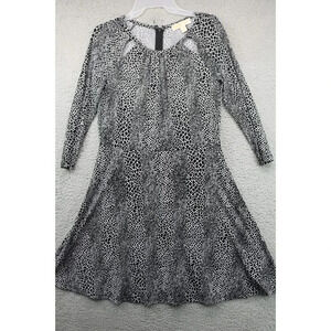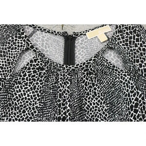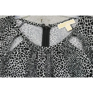 This is a really cute Michael Michael Kors Dress that is a size Medium. It has 3/4 sleeves and zips in the back. The material is 95% Polyester and 5% Elastine. It has a silky feel. Laying flat, it measures: Armpit to armpit-18.25". It is 36.25" in length. Very pretty and in good condition.