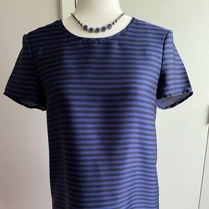 Elevate your everyday style with this elegant Michael Michael Kors women's top in EUC (Excellent Used Condition). Designed with a flattering slip-on silhouette, this short sleeve blouse features a striking **cobalt blue and black stripe pattern**, perfect for both workwear and casual chic.