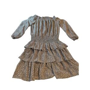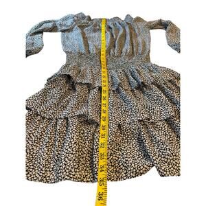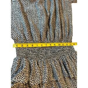 Chic and feminine Michael Michael Kors Sunari Dress in a delicate navy and white floral print. This off-the-shoulder dress features long sleeves with elastic cuffs, a flattering smocked waist, and a tiered ruffle mini skirt for a playful yet polished silhouette. Fully lined with soft black fabric for comfort and coverage. Perfect for brunch, date night, or vacation. Dress it up with heels or keep it casual with sandals. Size M. See photos for exact details and fabric tag.