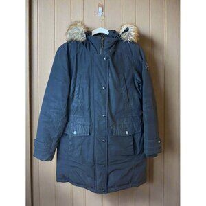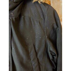 Stay cozy and stylish in this well-loved 3/4 length winter coat. It features a faux fur-lined hood, drawstring waist, and secure zipper with snap-button closure. Designed for warmth and comfort, it has multiple front pockets for convenience. Polyester/cotton - size large - Gently used. Some paint stains on the shoulder and paint wear on buttons, but all zippers and buttons work perfectly. Still a very warm, functional, and fashionable winter essential.