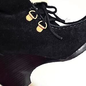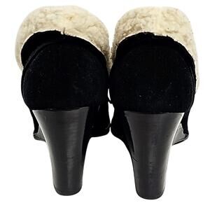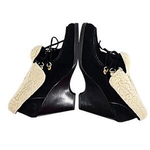 Step out in style with these Michael Michael Kors Wendi wedge booties! These stylish boots feature a chic lace-up design and cozy sherpa lining, perfect for keeping your feet warm and fashionable. The black suede adds a touch of luxury, making them a versatile addition to your wardrobe. These are in excellent condition. Get ready to turn heads with these must-have wedge booties!