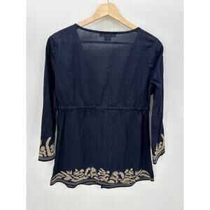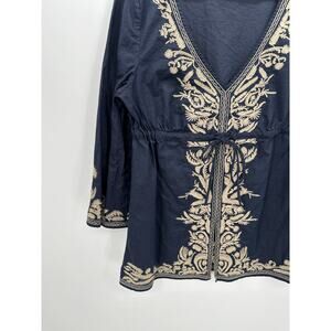Michael Michael Kors Blouse Women Large Navy Blue Cream Embroidery Cotton V Neck