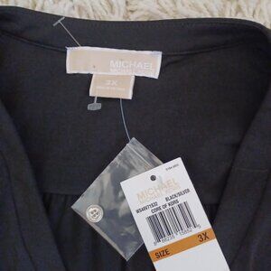 Brand new with tags Michael Michael Kors plus-size dress in size 3X. Features a sleek black stretch jersey fabric with silver-tone metal chain lace-up detail at the neckline and MK-engraved grommets. Includes a matching tie belt for a flattering fit and roll-tab sleeves for versatile styling.