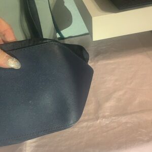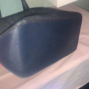 Absolutely gorgeous Michael Michael Kors in denim and gold with leather straps. Slide amount of cracking on the straps, but otherwise the bag is in good condition. It is beautiful blue denim, dark blue denim and gold tone hardware with the traditional large MK gold emblem one zip pocket in front. Zip top closure for slip pockets inside one zip pocket.