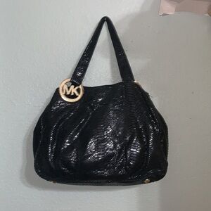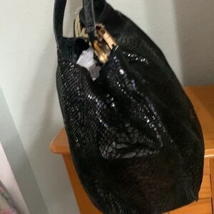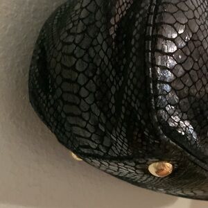Beautiful, black snake, skin look tote, gold hardware, large middle zipper divider pocket three sections in all one zip pocket 2 slip pockets gold protective feet on bottom. Key leash inside inside snap closure has been gently used. No rips, tears does have some spots inside, all items in my closet are preowned unless other wise stated new in listing