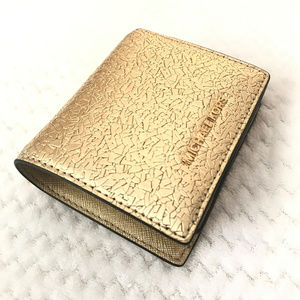 Michael Michael Kors gold color mini flap wallet. 100% leather. MK Rises monogram 5 credit cards compartments, big bills compartment and DL window. Approx: 3,5"X4,5"