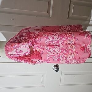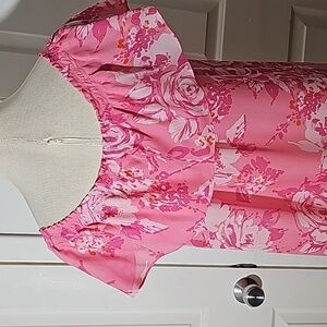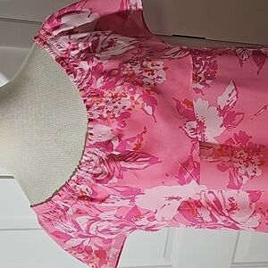 Lovely silk pink floral blouse off the shoulders. Size large. pit to pit flat measurement is 21". From under arm to hem is 27". Very good used condition and quality. Consider making a bundle and get an even better offer and save on shipping.