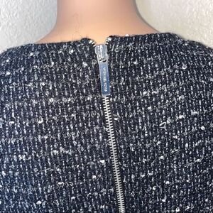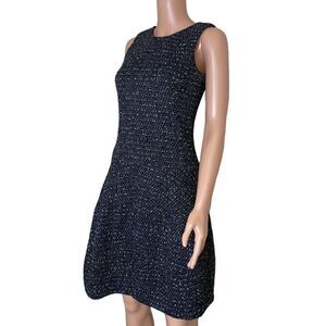 black tweed dress, sleeveless sheath dress, textured knit dress, fit and flare silhouette, elegant cocktail dress, office to evening outfit, classic little black dress, knee length tweed dress, formal business dress, minimalist chic style