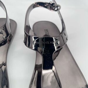 Michael Kors jelly sandals, MK gunmetal thong sandals, Michael Michael Kors silver sandals, Women’s size 6 jelly sandals, MK logo plate sandals, Designer summer sandals, Jelly flip flops Michael Kors, Waterproof thong sandals, Metallic jelly sandals, MK beach shoes, Michael Kors slide sandals, Silver jelly sandals women, Thong sandals with logo, Summer fashion sandals, Michael Kors rubber sandals