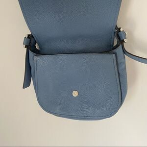 Blue color cross body purse. Flap opening. This bag is heavy.
