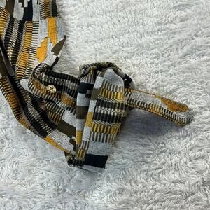 Cream blouse with yellow and brown pattern. Features elastic cinch tie waist and patch style breast pockets with gold button hardware. Long sleeves may be rolled, for a half sleeve secured with loop and button, and there are epaulettes on the shoulders. Mock neck collar with button down front hidden by fabric. Nice amount of stretch in the waist, but the rest of the blouse is not stretchy.