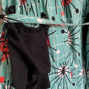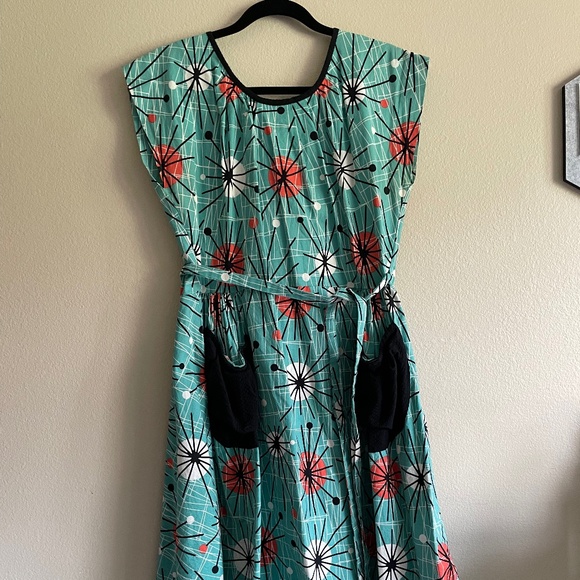 I bought this beautiful dress from Hunny Bunny on Etsy years ago. Very pretty, and in great condition. 1950s style wrap dress. With pockets!!! Wrap closure, the back fold down. I always pinned it up. Size Large. 39" top to bottom. 16.5" flat across the waist. 19" flat underarm to underarm. The fabric doesn't stretch. 100% cotton. Fun atomic style! Great condition, I only wore it a couple of times.