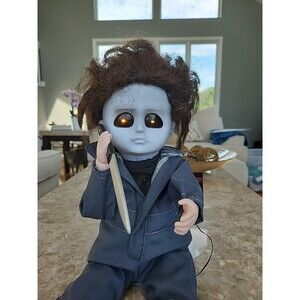 New Michael Myers Animated Doll. Makes loud noises, eyes light up, knife moves up and down. 12" high in sitting position.
