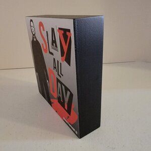Add some killer vibes to your spooky setup with this bold Halloween decor block featuring the legendary Michael Myers and the phrase "Slay All Day."