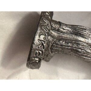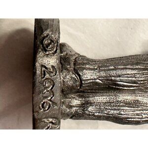 This detailed pewter sculpture by Michael Ricker features a sailor boy holding a boat. A collectible piece made in 2006, showcasing craftsmanship.