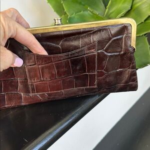 This beautiful Michael Rome Designs clutch purse is crafted from genuine leather with a rich, deep brown croc-embossed pattern that feels luxurious and timeless. Based on the condition shown, it appears seldom used, if used at all, with clean edges, a glossy finish, and no obvious signs of wear.
