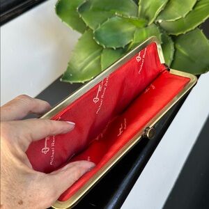 Inside, the clutch opens to a vibrant red interior that is exceptionally clean. The interior includes multiple compartments for organizing cards, cash, receipts, or small essentials. The gusseted sides allow the purse to open wide while maintaining its shape. The leather interior flap also appears to be in excellent condition, consistent with a purse that has been very gently used.
