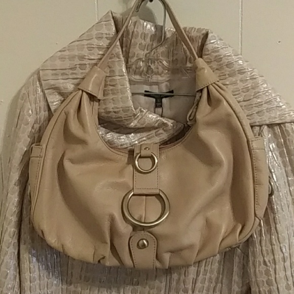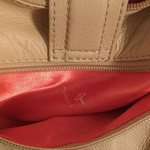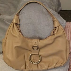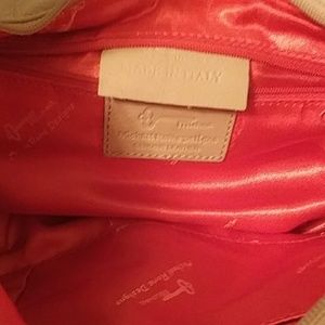 Genuine leather from Italy. Gorgeous orange authentic logo lining. Pockets on outside with two side snaps. Light tan. Measures 15 by 9 down. Mettalic magnetic closure.Excellent new condition.