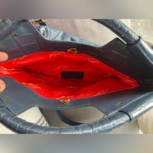 Stylish navy blue leather tote with a textured crocodile-accented trim. Features a comfortable top handle and detachable shoulder strap for versatile carry. Clean, modern silhouette designed for everyday use. Navy blue color adds a sophisticated touch.