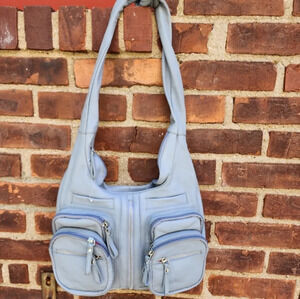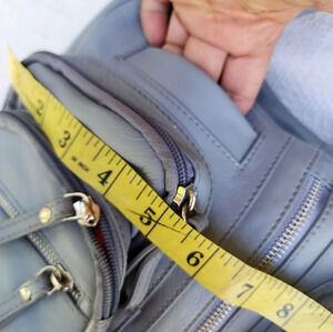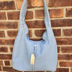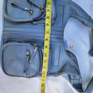 This bag has never been used and my mom probably bought it in the nineties. It ties at the shoulder so you can adjust it longer or shorter. Even the interior is beautiful and the color is really outstanding.
