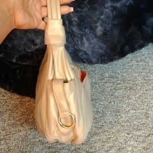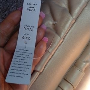 Beautiful Gold authentic leather Michael Rome purse with tags. Zipper closure accompanied by matching ring hardware with magnetic closure for the main and side compartments. 3 inside pockets including 1 that zips. Has small spot on front that's slightly lighter color. Not really noticeable unless you look really close.