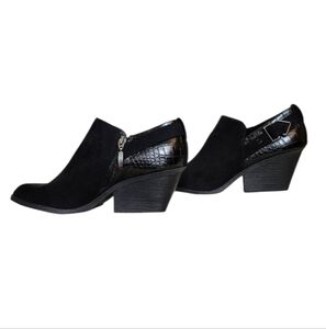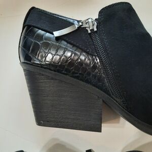 Sleek black ankle booties with stylish buckle. Perfect for versatile wear.