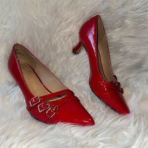 Keywords: Michael Shannon, Vayda pump, red heels, patent leather, pointed toe, buckle detail, women's shoes, size 6.5, kitten heel, quiet luxury, minimalist, mob wife, office, business, date night, chic, contemporary